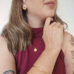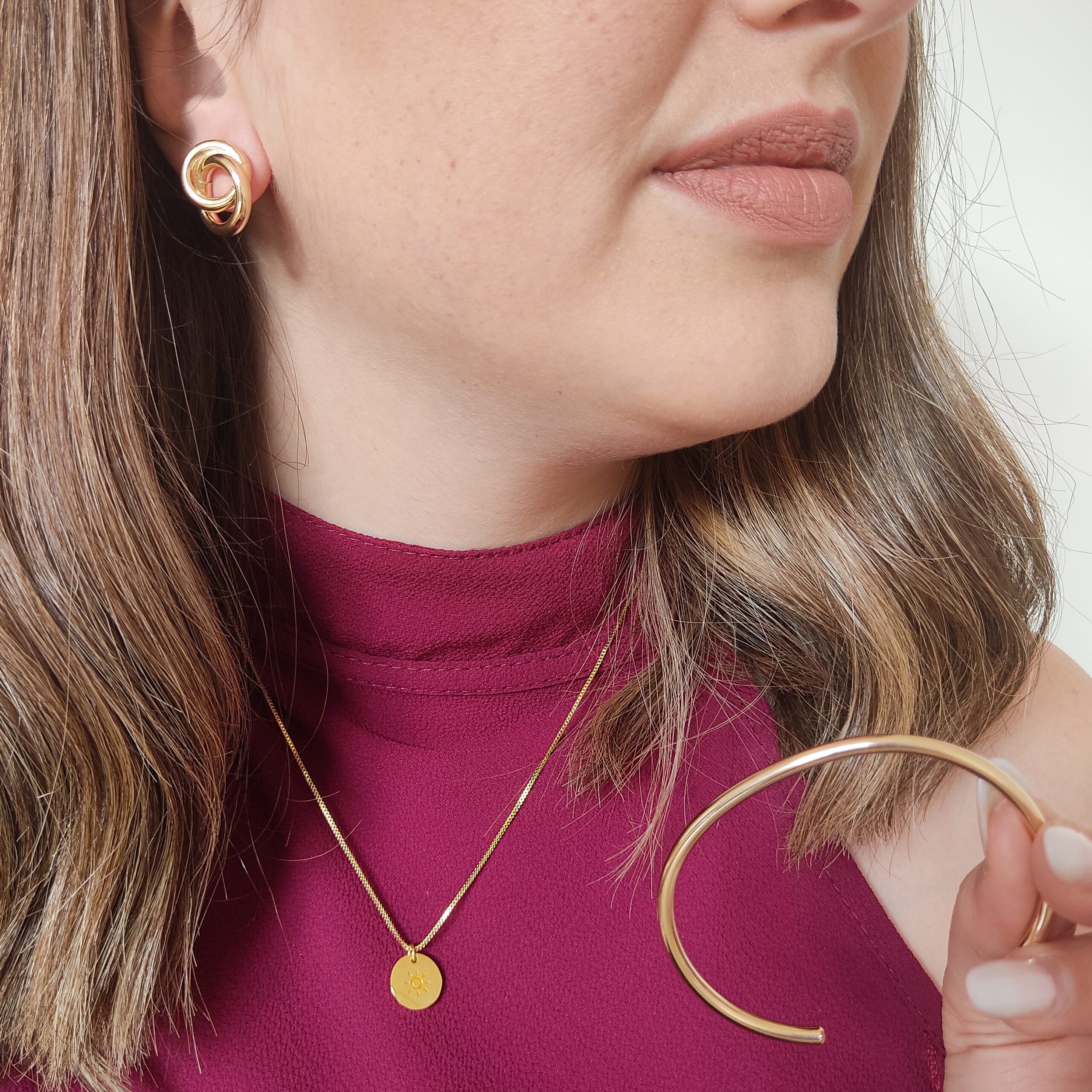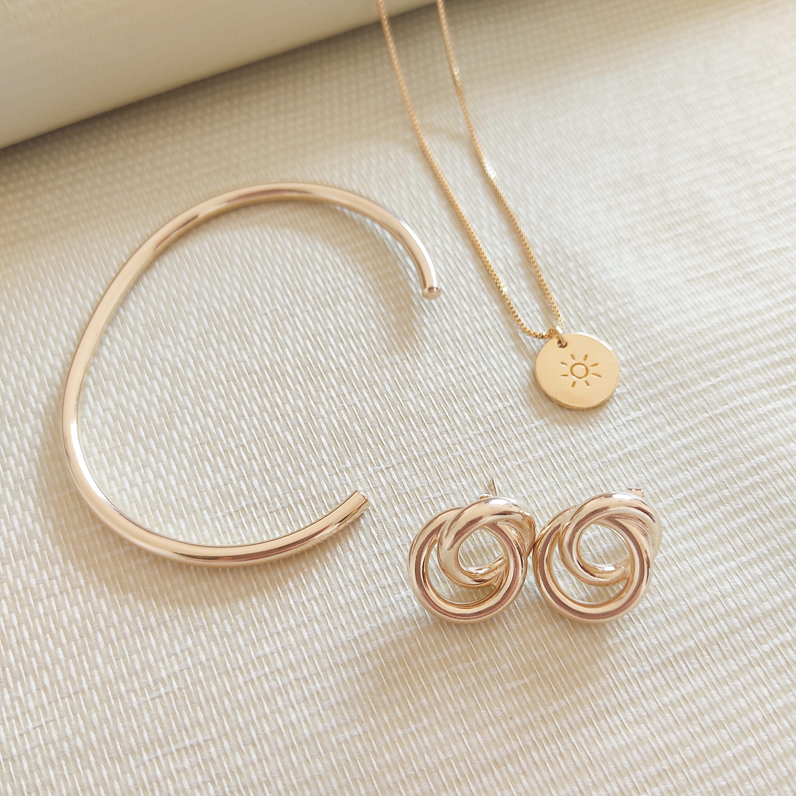 Apresentando um par de brincos de dois elos, bracelete tubo e colar com um encantador pingente de sol.