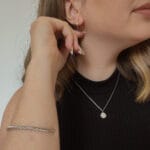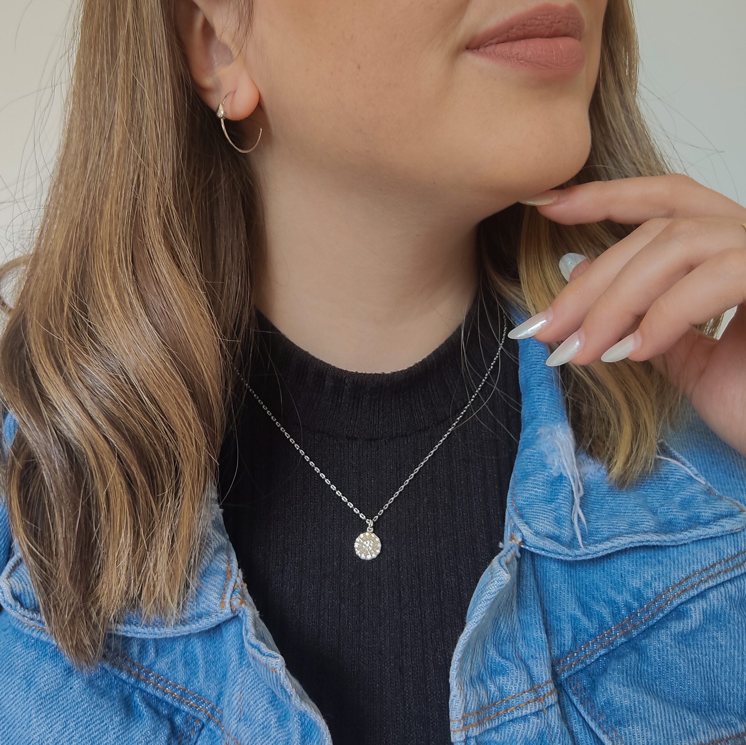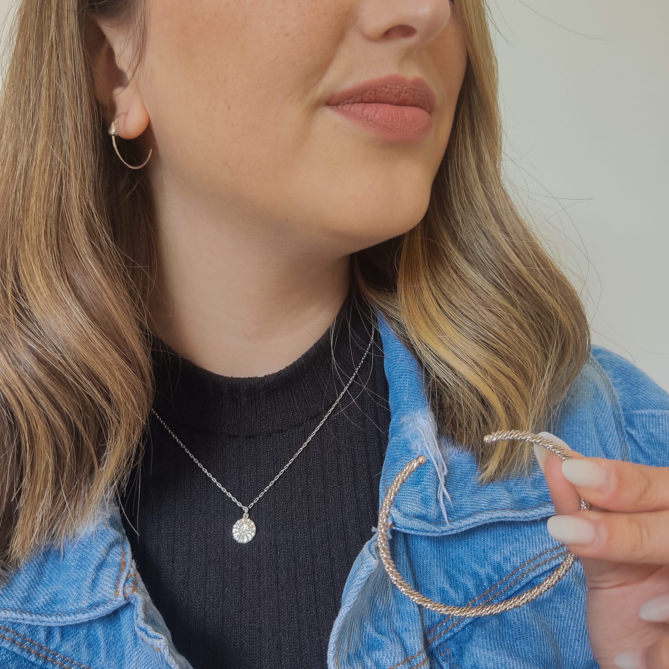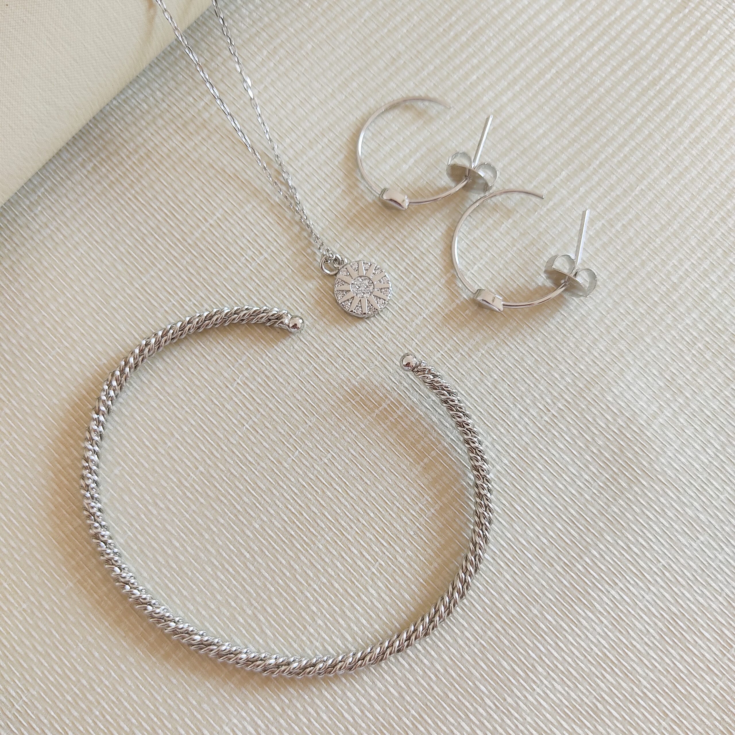 Um kit elegante com banho em ródio branco, composto por um par de argolas modernas, um bracelete delicadamente torcido e o colar Luz, com um pingente de sol radiante cravejado de microzircônias.